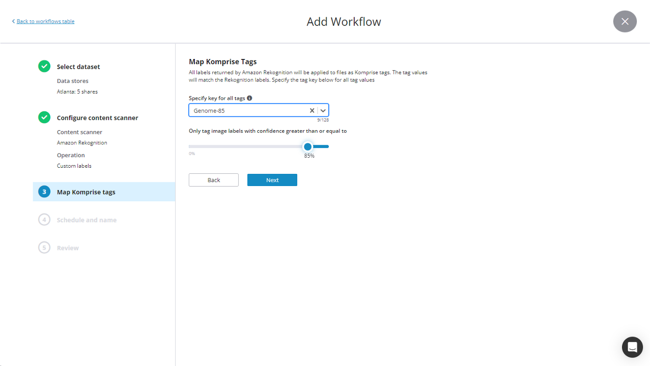 - Komprise automatically executes the workflow on the prescribed schedule and spins up the AI service only when new data needs to be processed which eliminates unnecessary AI costs;