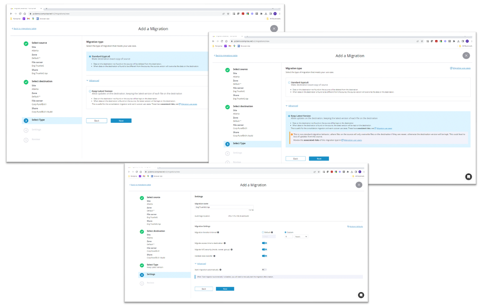 - Consolidation migrations: Consolidation migrations enable multiple sources migrating onto one destination (e.g., to consolidate hardware, sites or data, due to acquisition, merger or to re-organize existing data). A simple consolidation migration may consolidate data into different subdirectories on the destination. Users can configure and run multiple standard or pre-loaded migrations into subdirectories, in parallel, as needed.