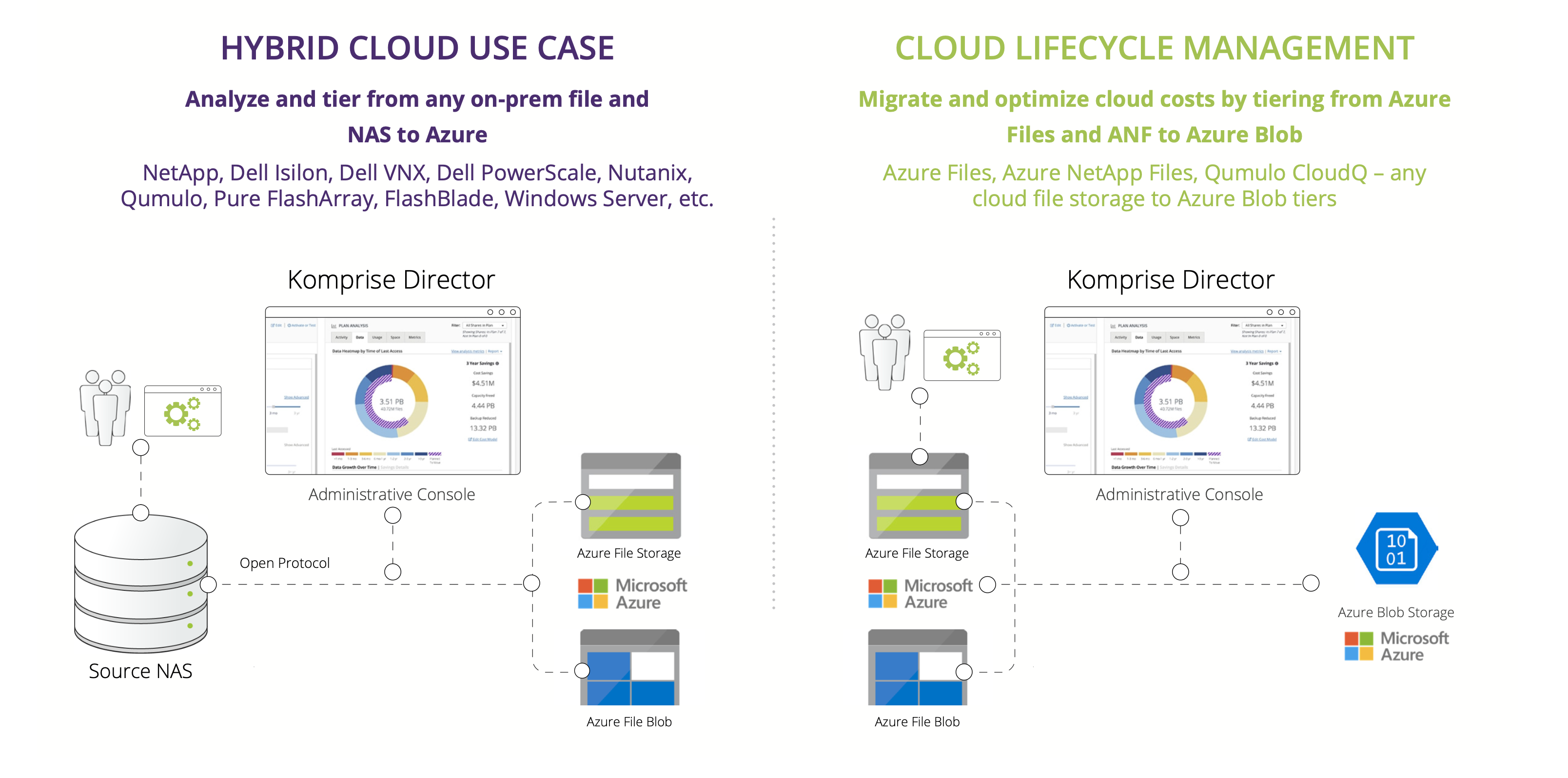 - Hybrid Cloud Tiering from On-Premises File Storage to the Cloud: Many enterprises already have on-premises file-storage network attached storage (NAS) environments and wish to optimize spend by tiering cold data to the cloud. Komprise Intelligent Tiering for Azure analyzes across any vendor NAS including NetApp, Dell, Windows Server, Pure Storage, Nutanix and others to identify cold data and transparently tier it based on custom policies to the appropriate Azure Blob and Azure File tiers. Read how Lummus Technology is saving roughly 80% on storage and backups annually by using Komprise to correctly identify cold data for tiering to Azure.