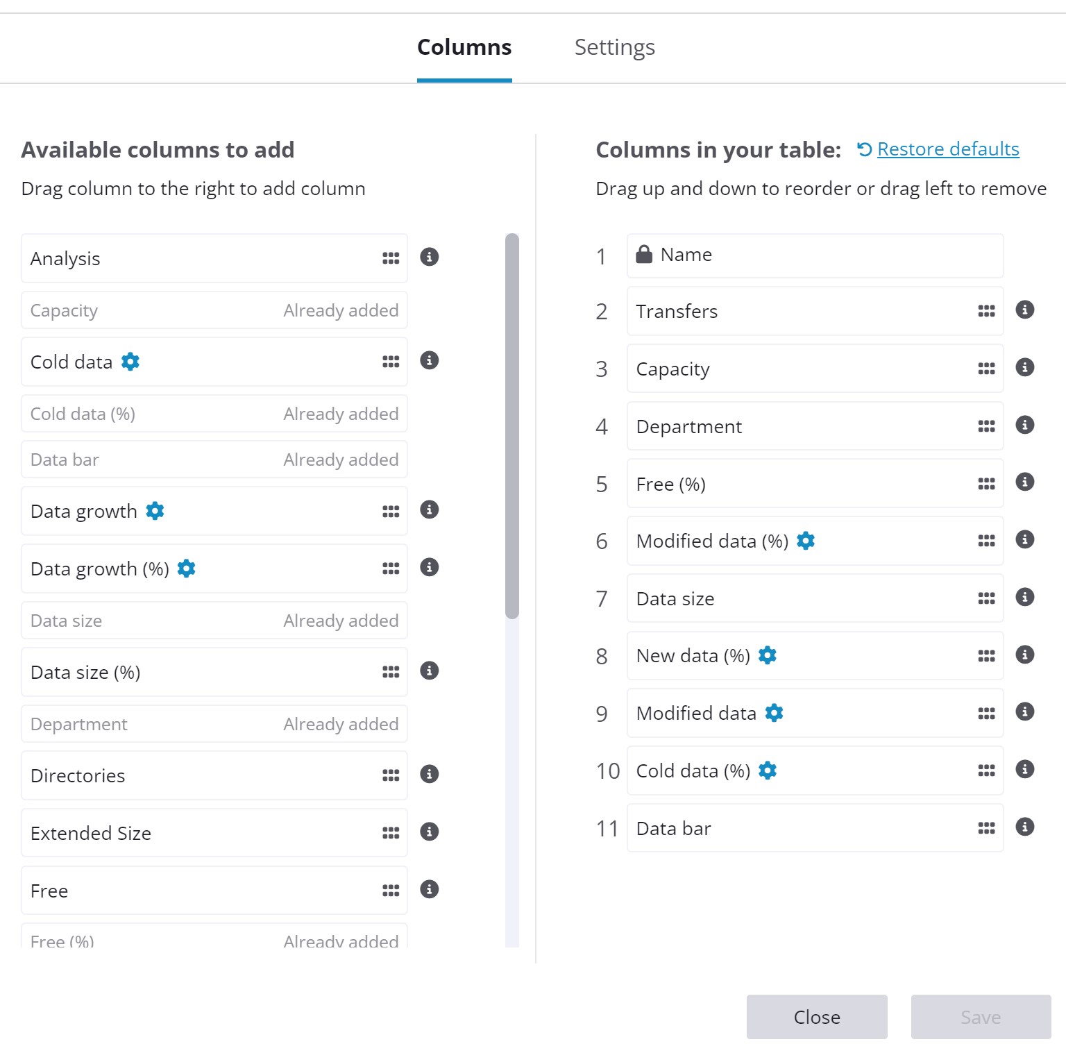 Storage Insights includes over 25 columns that allow users to choose what information to display, and in what order to understand the current state of enterprise storage assets across sites.