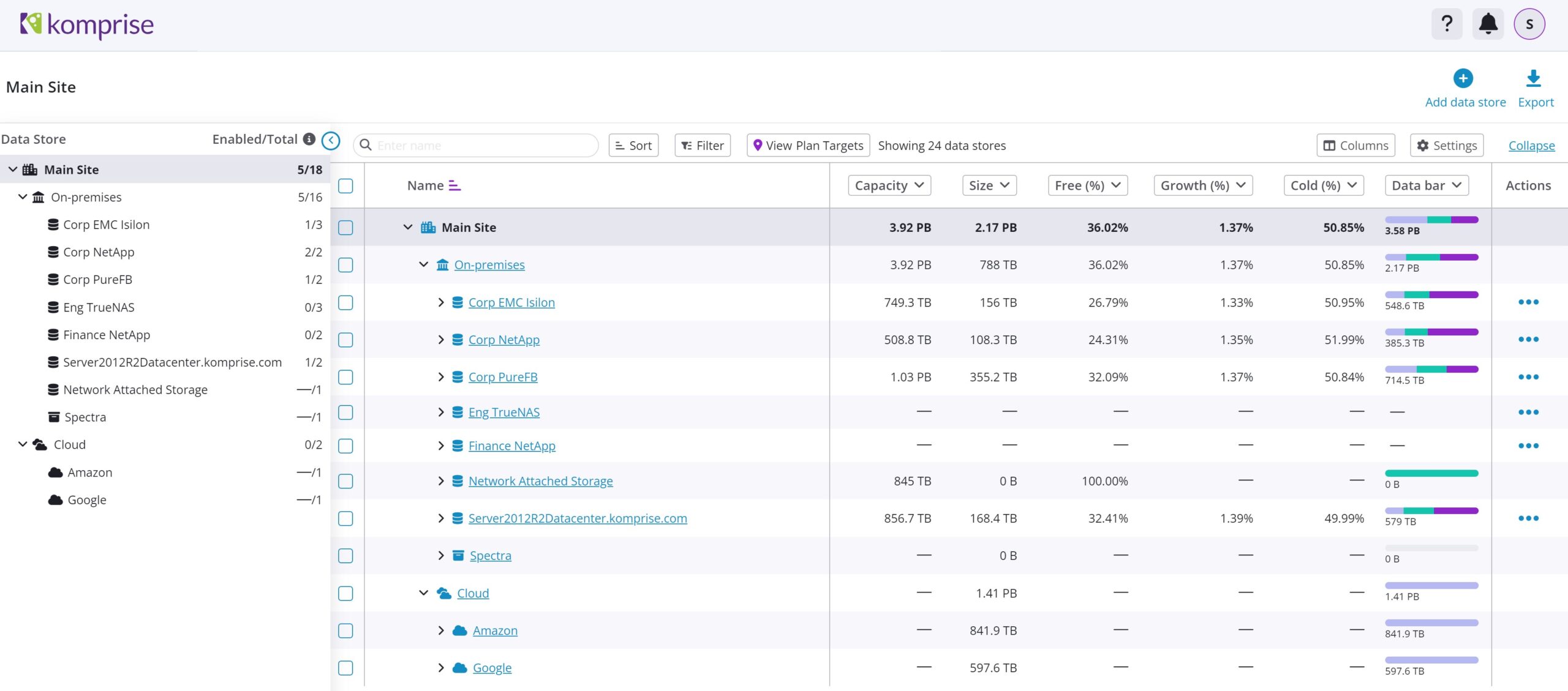 Now, Komprise users can drill down into file shares and object stores across locations and sites in a single console. Storage managers can spot trends and track and manage custom metrics across storage environments in one place, and they can take action right from the console.