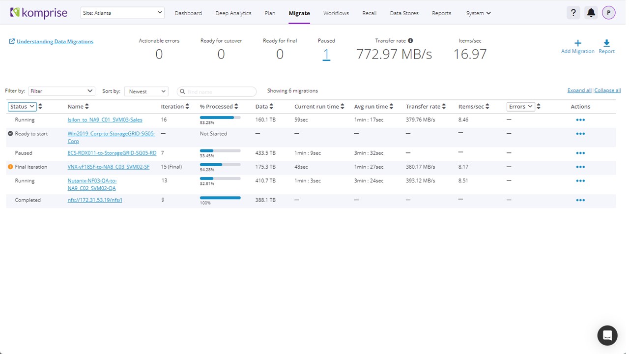 Komprise Elastic Data Migration delivers the fastest migration technology for both SMB and NFS data, often 25X faster than common migration tools and with built-in reliability features such as checksums and automatic retries.