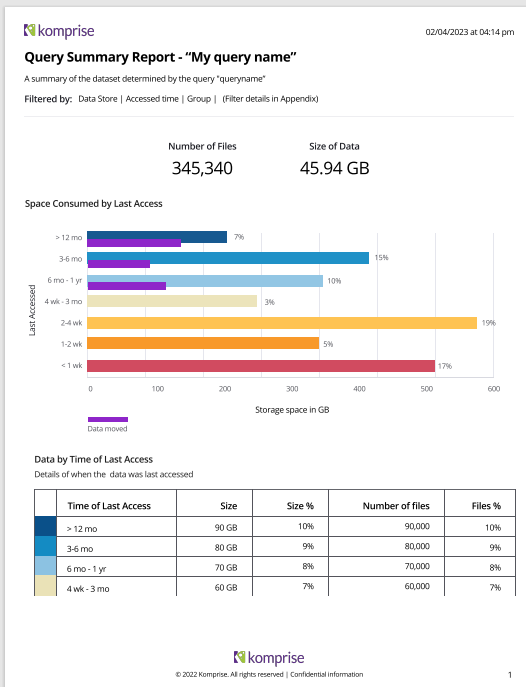 The purpose of the Query Summary Report is to deliver insight on any Deep Analytics query, showing number of files, size of data and space consumed by last access of those files.