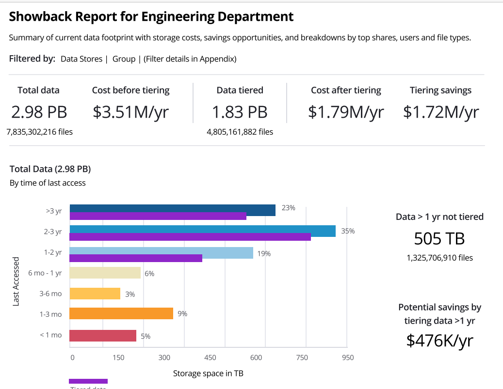 The Showback Report displays the current data footprint for a department along with breakdown by top file types, shares and users. It shows storage costs, savings from ongoing data tiering to lower-cost storage and further savings opportunities.