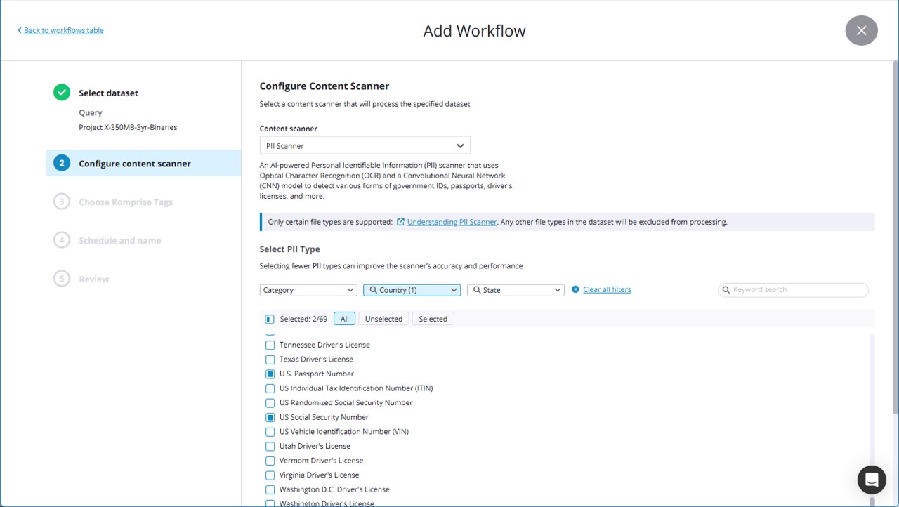 - PII Detection: Select which PII data types to scan for such as national IDs, credit card numbers and email addresses. Komprise supports multiple classifications to identify diverse PII types within any given file.