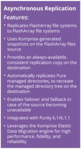 Komprise provides asynchronous replication to enable FlashArray file users to protect data by periodically copying it from a source to a destination. (For full protection, it’s recommended that the source and destination file servers should be physically disparate—and even better, geographically distant.)
