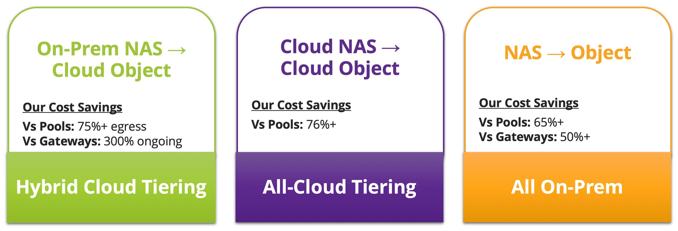 This automated storage-based tiering when used within a vendor’s storage array allows the vendor to reduce costs by shifting less-active data blocks to lower cost tiers. This solution is sensible for managing data placement within a storage array and tiering snapshots to the cloud. But using storage tiering to move cold files to a destination outside the storage array such as the cloud leads to excessive recalls, egress fees, defragmentation and unexpected rehydration. This in turn results in high costs and lock-in.