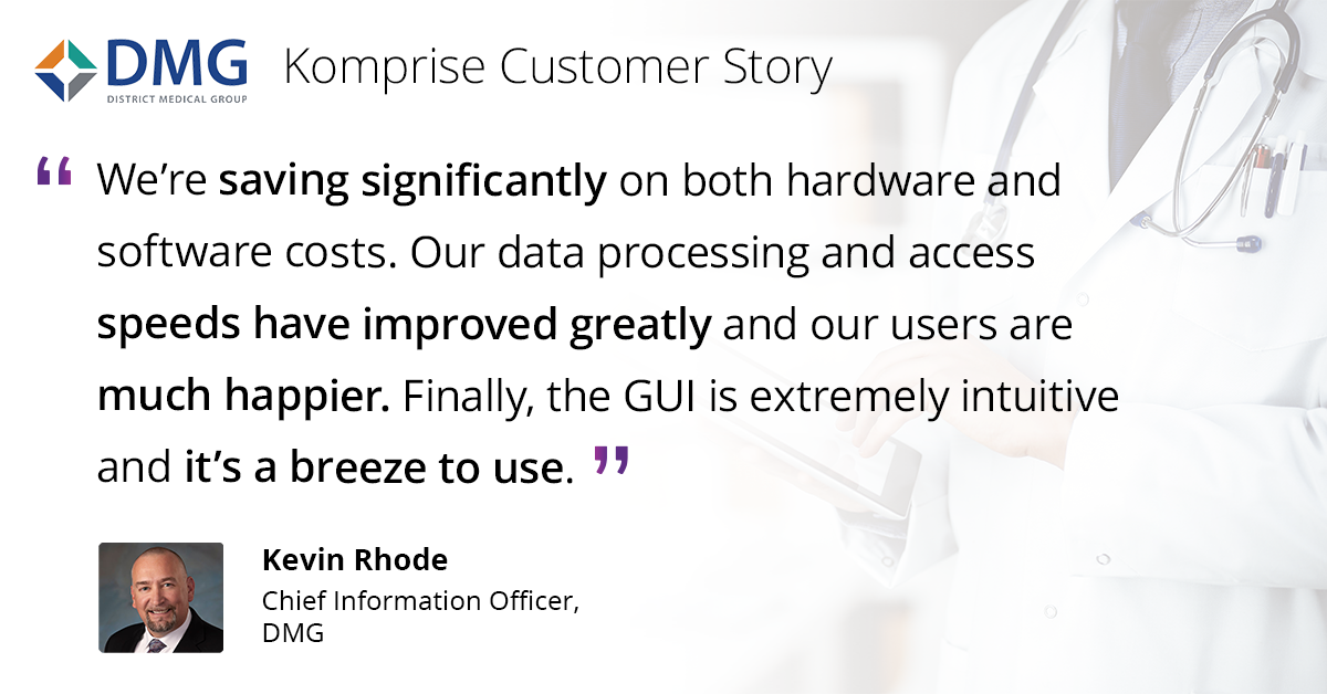 “We love how Komprise incorporates dynamic links that work on any storage, which means we still have access to the moved files on our network. The fact that we could drastically reduce the footprint on our file servers was the other main selling point of Komprise.” – Kevin Rhode, CIO, District Medical Group
