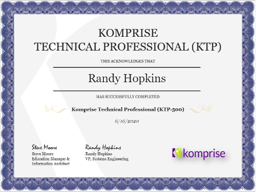 Komprise University and KTP certification is instructor led. There are different modules, focused on Komprise Analysis, Hybrid Data Management, Cloud Data Data Management, Elastic Data Migration, etc. KTP graduates each receive a certificate based on the course they’ve completed. There is also a private LinkedIn group for KTP alumni and we host regular sessions with Komprise product management to review the roadmap and provide input.