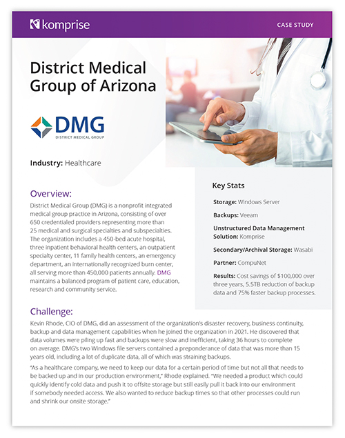 Read the case study to learn how Komprise and Wasabi helped DMG achieve data storage cost savings of $100,000 over three years, 5.5TB reduction of backup data and 75% faster backup processes.