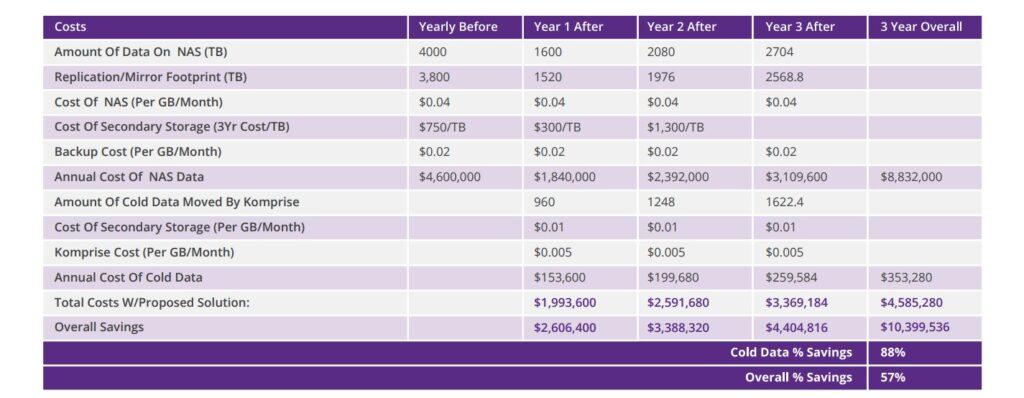 - Cost of Cold Data Storage: By identifying and transparently archiving cold data on secondary storage, Komprise reduces the cost of storing cold data