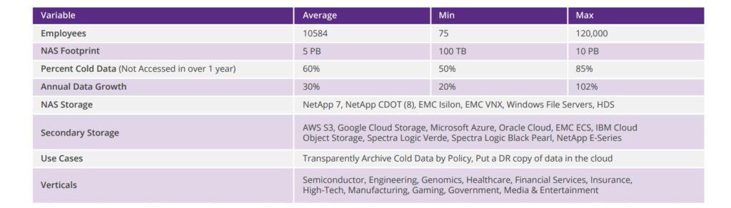 The TCO shown is a culled aggregation of data from 10 organizations using Komprise to manage data across NAS, object storage, and cloud. The customer profiles are as shown in the table right. The data footprint in the organizations varied from 100 terabytes of NAS data to 10 petabytes of NAS data.